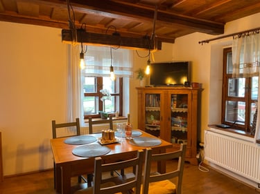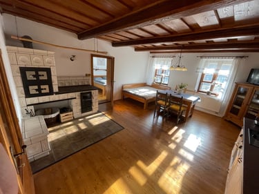 Naše chaloupka nabízí jeden apartmán, který Vás ale jistě uchvátí svojí jedinečnou atmosférou. Jedná se o prostory, rekonstruované s ohledem na původní architekturu. V apartmánu u pece, naleznete vše co budete potřebovat k tomu, abyste si krásně odpočinuli a vychutnali klid a pohodu, kterou nikde jinde nenajdete. Jak již je zřejmé z názvu, dominantou je zde nově postavená pec v původním stylu, která lze využít k vytápění objektu, ale taky k vaření či pečení. Pec disponuje jak troubou v přední části, ale lze ji taky využít jako udírnu.